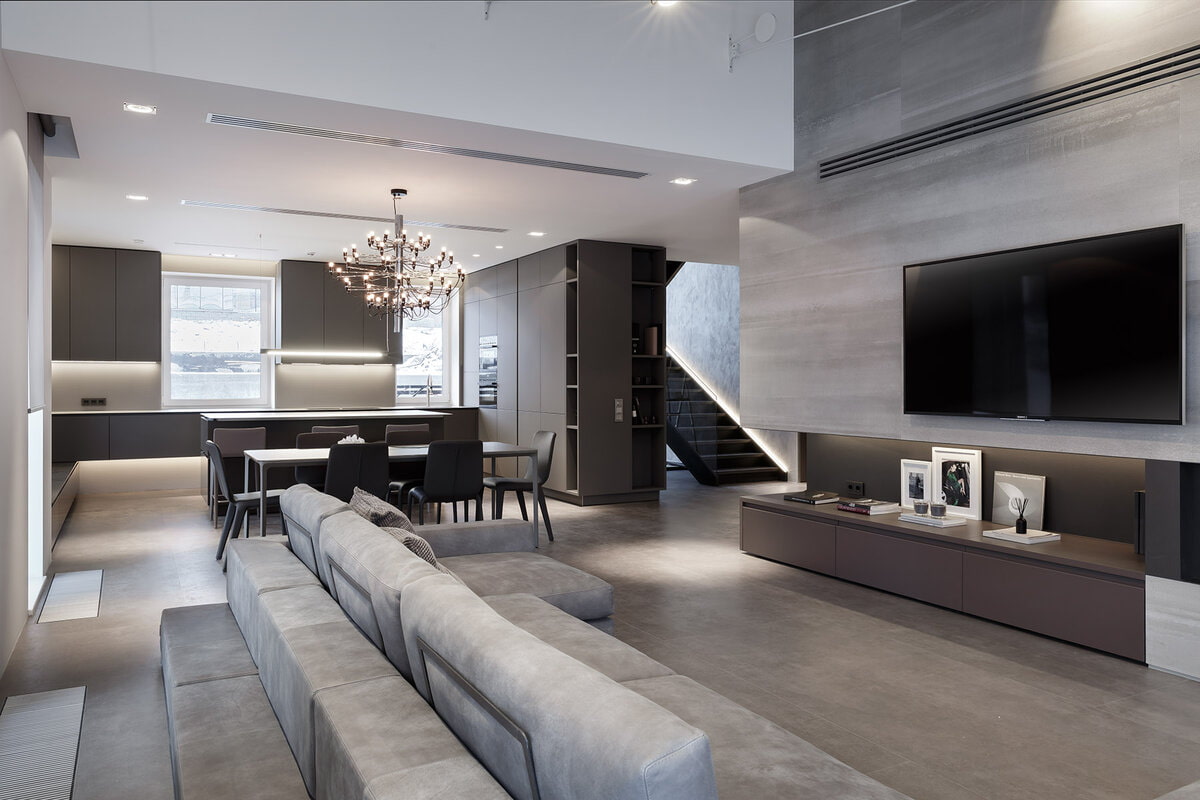 The main task of the living room is to comfortably accommodate all family members and guests. The large modern modular sofa can be used for both watching TV and sitting at a table. And the fold-out design provides additional sleeping space.