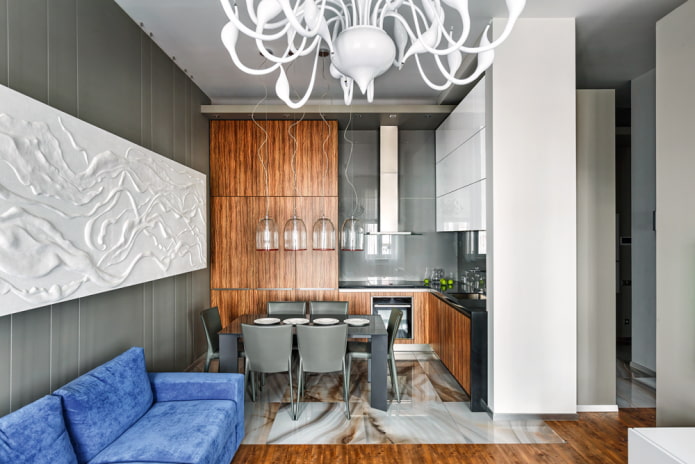 In interiors in the style of functionalism, textures are often used: concrete, brick, glass, mirror, wood, stone, leather, fabric.