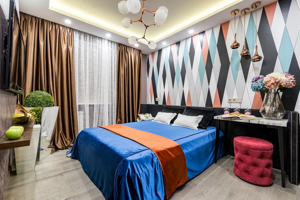 Geometric ornaments are in trend today. They can be lines, circles, rectangles, rhombuses of various shades. When choosing a pattern for the interior, rely on the dimensions of the bedroom: small figures will ripple in the eyes, and large ones will visually reduce the area of the room.