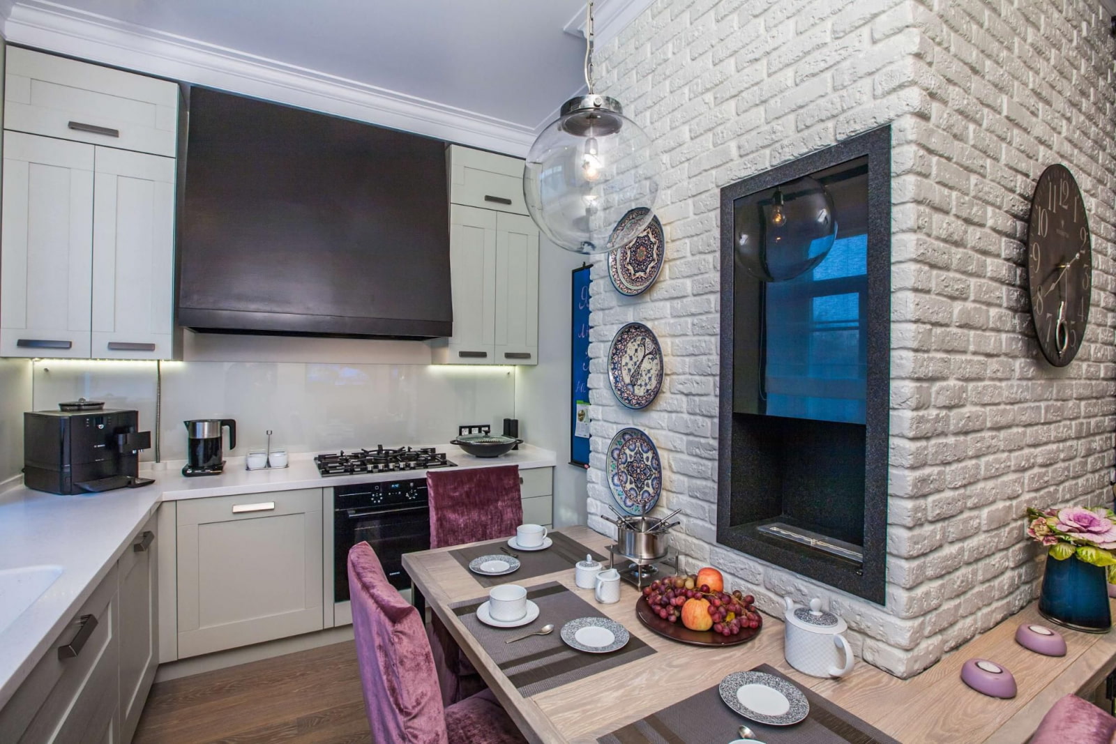 The photo shows the interior of the kitchen with a work area, decorated with white plaster tiles with imitation of bricks.