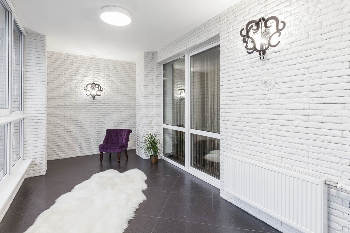 In the photo there are walls with plaster tiled trim in the interior of a spacious loggia.