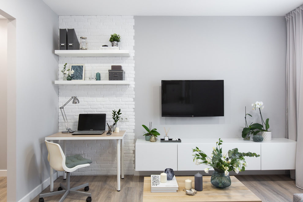 The photo shows the interior of the kitchen-living room, decorated with plaster tiled finish with imitation of bricks.