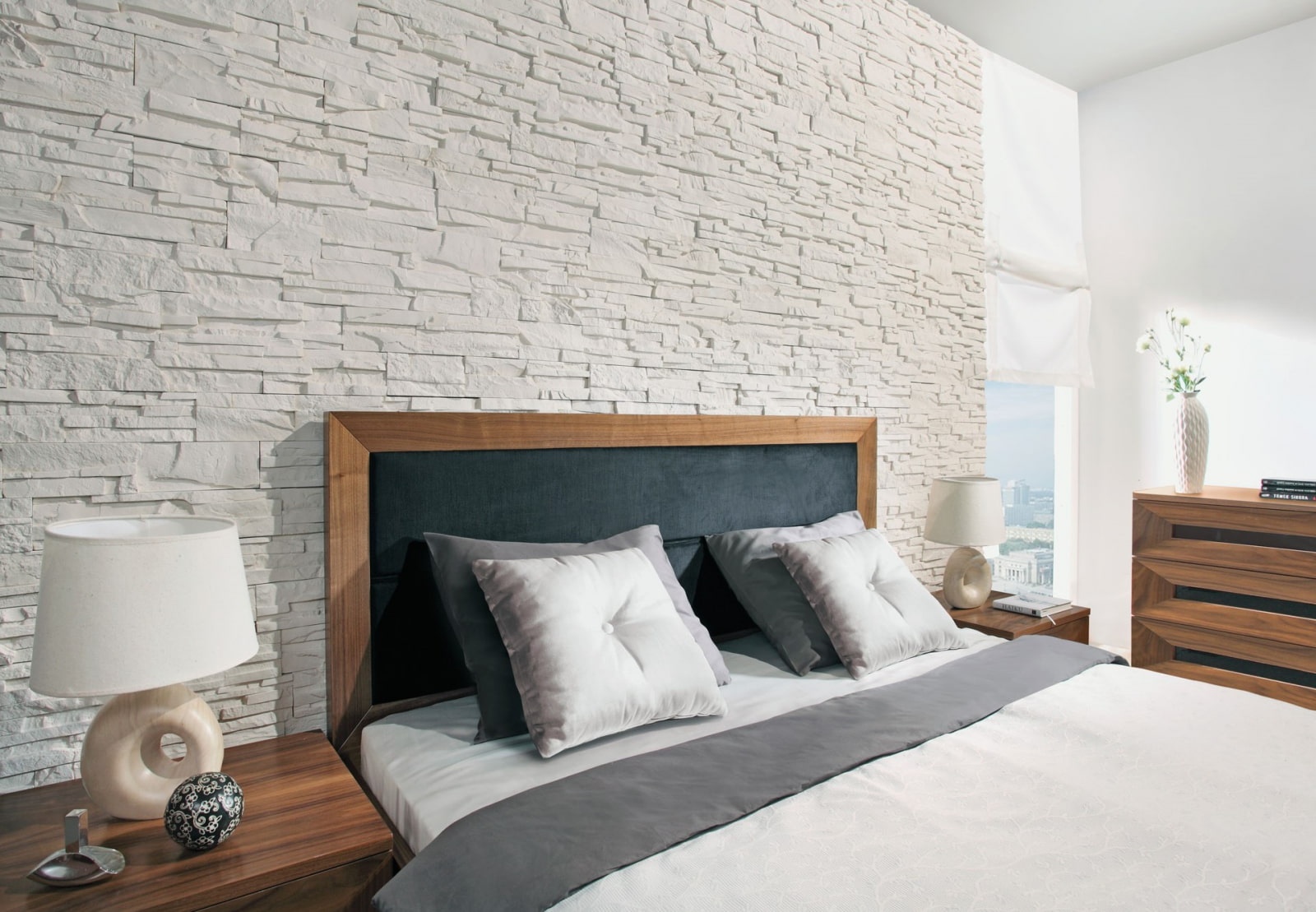 In the photo there is a wall in the bedroom, decorated with plaster tiles imitating white stone.