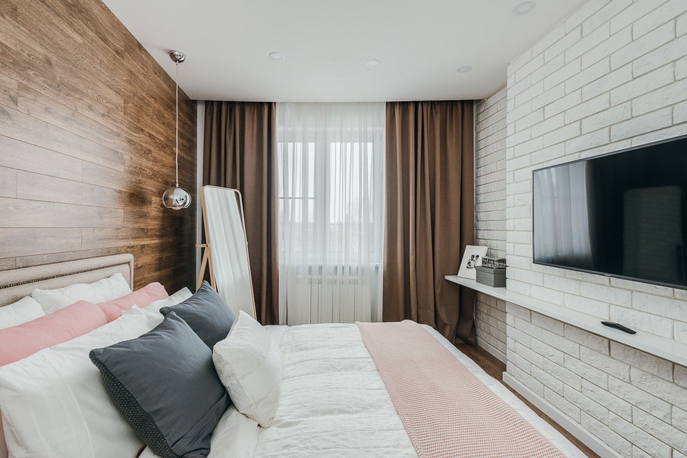 In the photo there is a plaster tile finish under a brick on the wall in front of the bed in the interior of the bedroom.