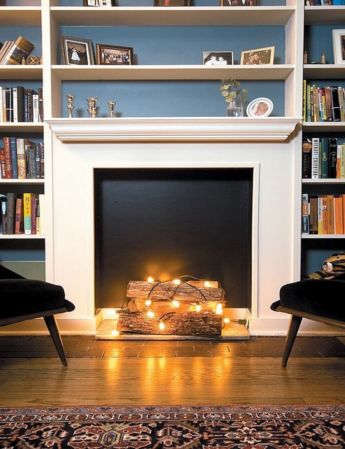 By decorating the fireplace with garlands, you can create an imitation of live fire. It doesn't have to be a real fireplace: a decorative woodpile on a tray, a bunch of branches wrapped in a monochromatic flashing garland will remind you of a real flame. A similar decoration looks great in a decorative fireplace, under a Christmas tree, or even just on a coffee table.