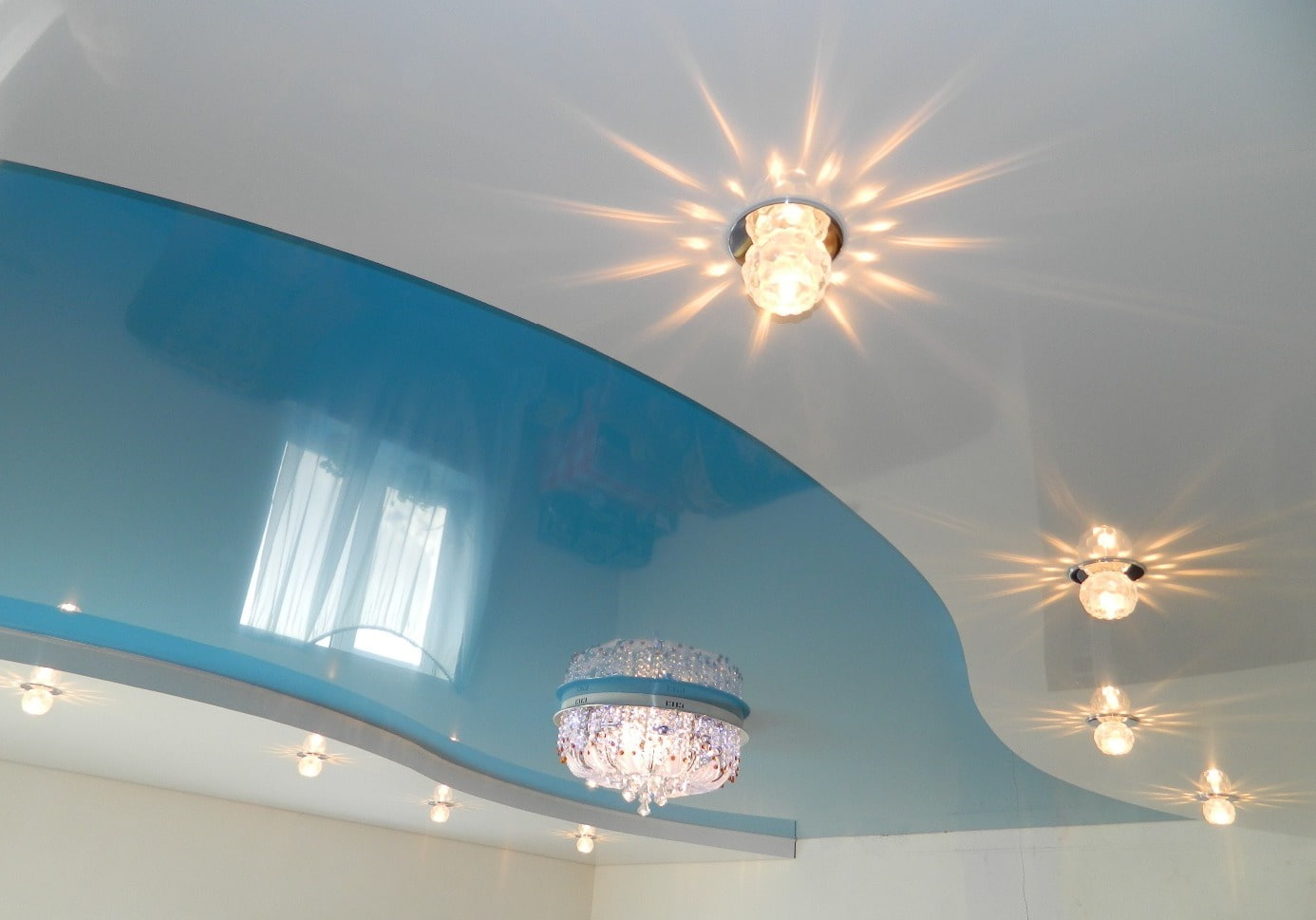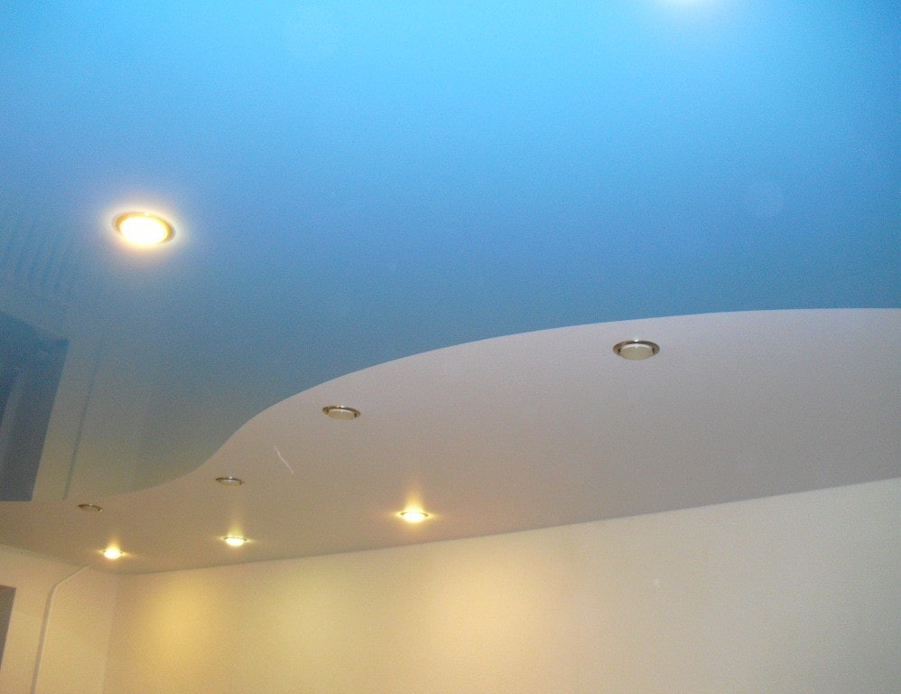In the photo there is a 2-level blue and white satin ceiling.
