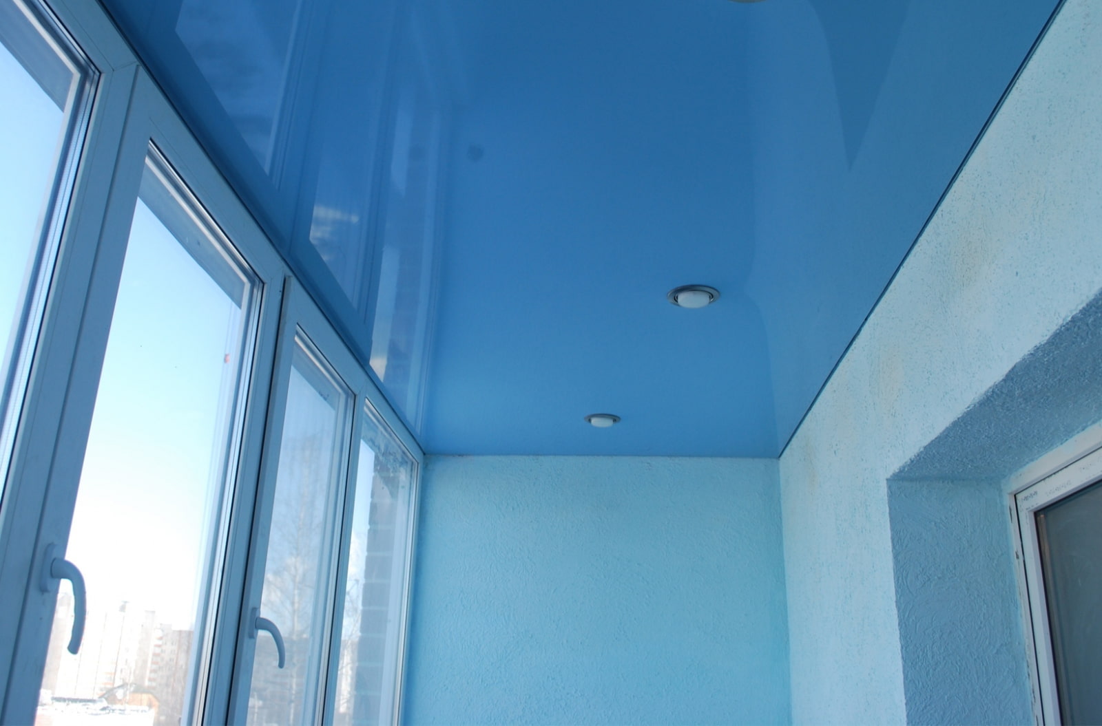 In the photo there is a blue stretch canvas made of gloss on the loggia.