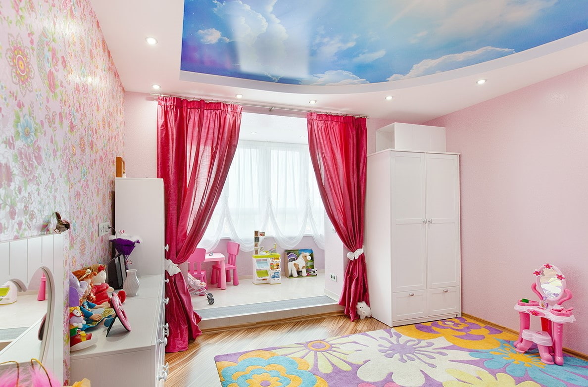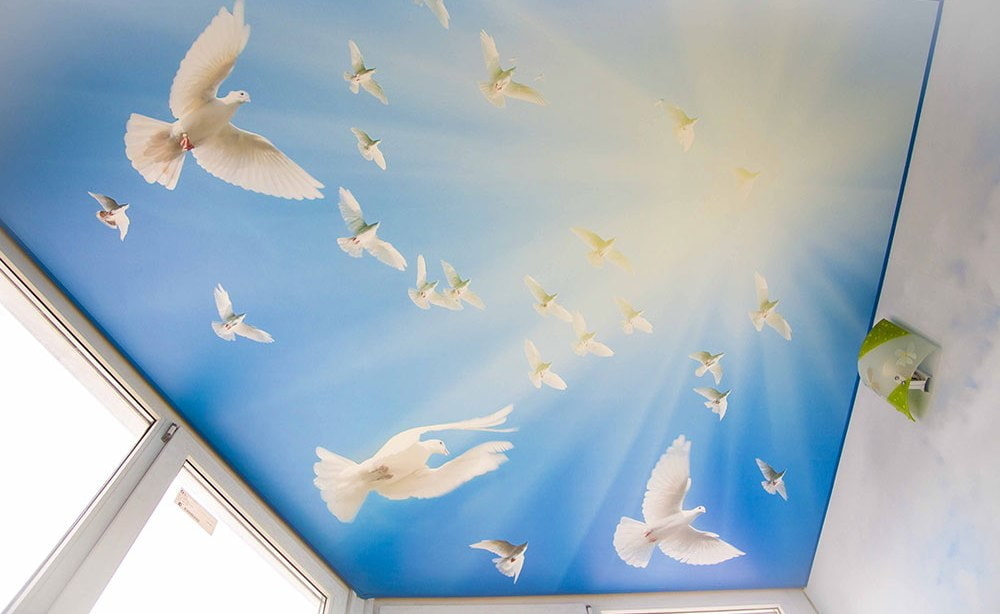 The endless possibilities of photo printing in the form of a sky with clouds above the crowns of trees, with birds, with an endless galaxy with stars or other images and drawings, will become a stylish and attractive cladding of the room.