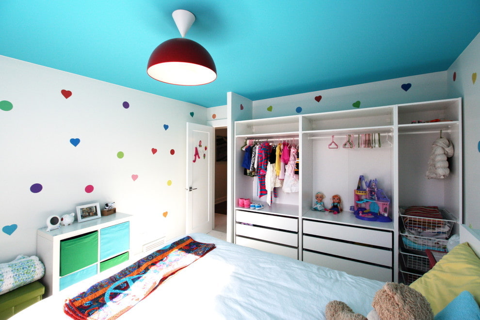 For a bedroom, such a color ceiling solution will be especially appropriate, since it has a relaxing effect on the overall atmosphere of the room and evokes associations with tranquility and relaxation.