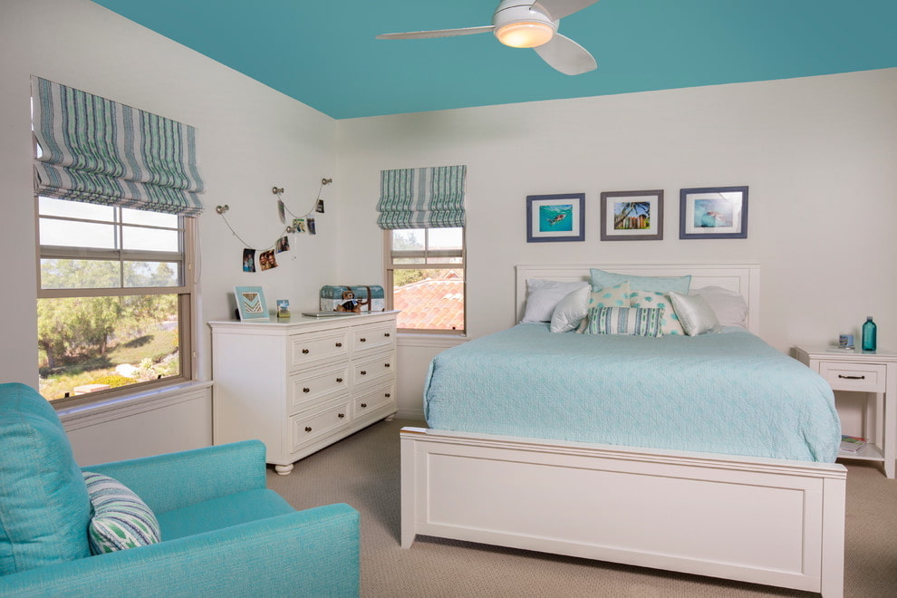 Pictured is a teenager's room with a blue painted ceiling.