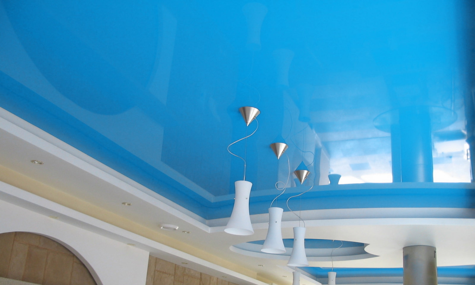 The photo shows a two-tone white and blue ceiling structure.