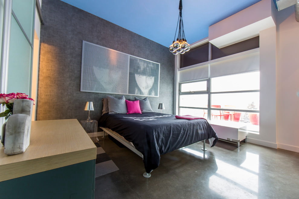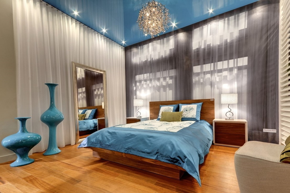In the photo there is a blue stretch ceiling made of gloss in the interior of the bedroom.