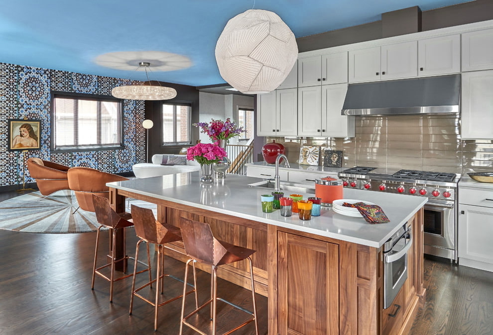 The ceiling is blue, it looks quite unusual and forms a calm, harmonious, but at the same time very stylish and interesting design.