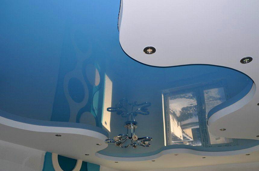A smooth, streamlined figure, in the form of a round blue or blue insert, will be pleasing to the eye. Such stretch ceiling structures will help to diversify the interior of the room and smooth out its rectangular shape.