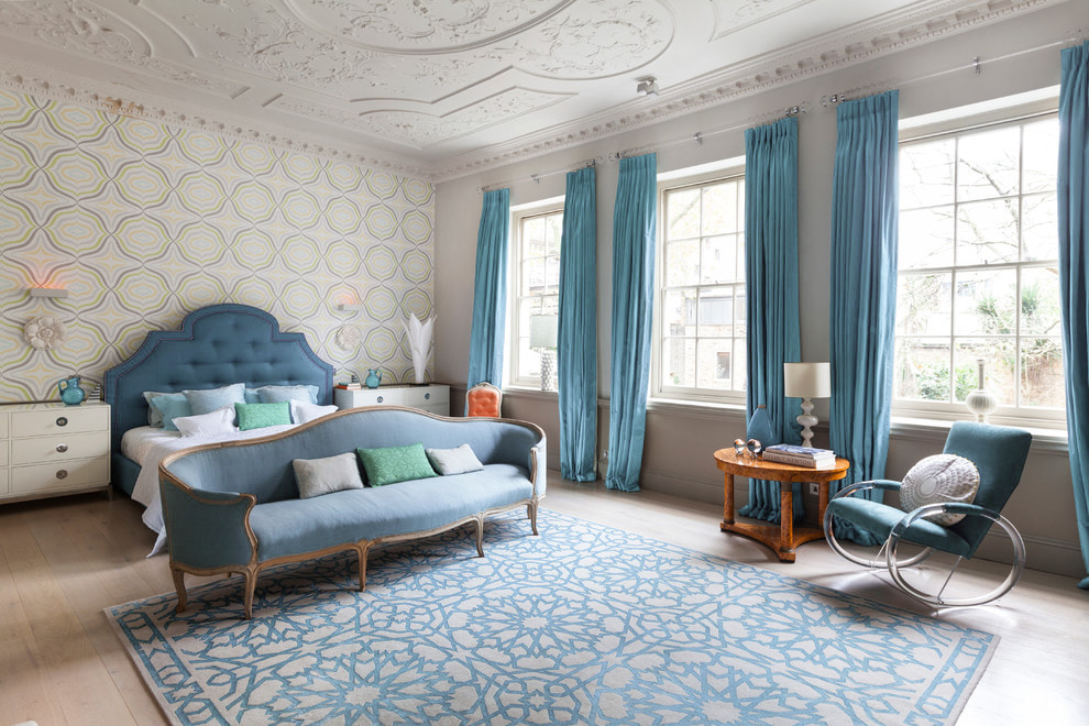 The interior with blue curtains will harmoniously look finishing in light colors. The most advantageous wall decoration options are white or beige wallpaper. Small patterns, plastering effects or vertical stripes are suitable for classic renovations.