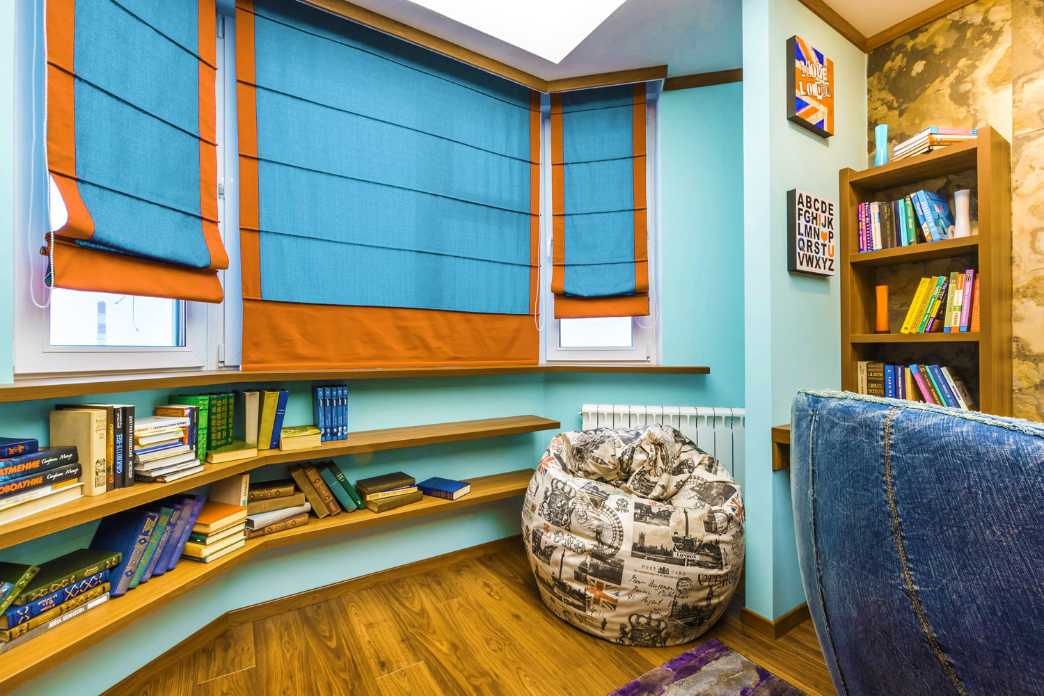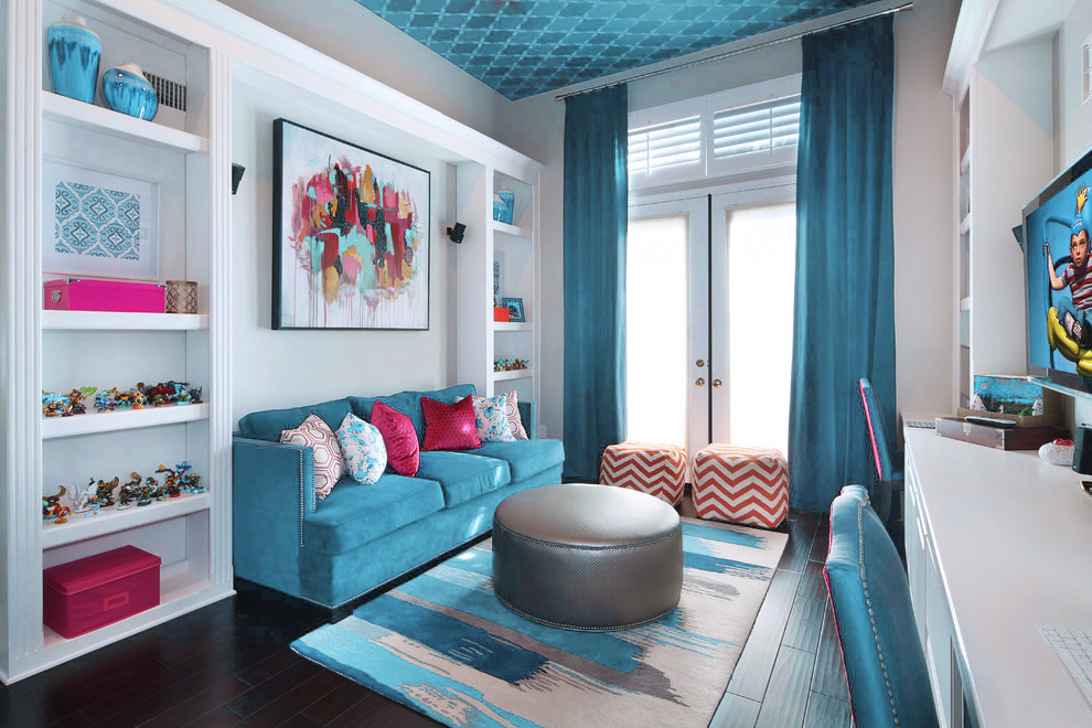 The combination looks good in the interior of the nursery and living room. Long curtains will go well with blue Roman shades, which can be raised as much as possible if desired.