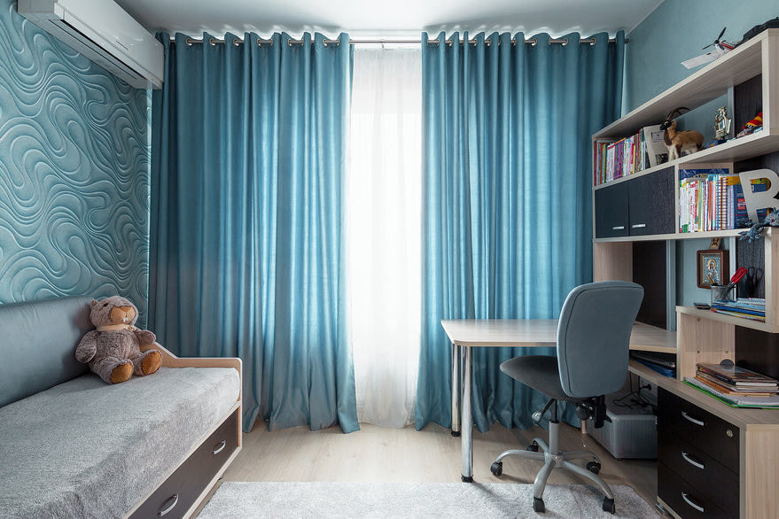 Blue curtains are suitable not only for decorating a child's room for a boy, cute drawings or a combination of heavenly with a delicate pink color will decorate a nursery for a girl. A good solution would be curtains with photo printing, your favorite heroes of fairy tales and cartoons can be depicted on them.