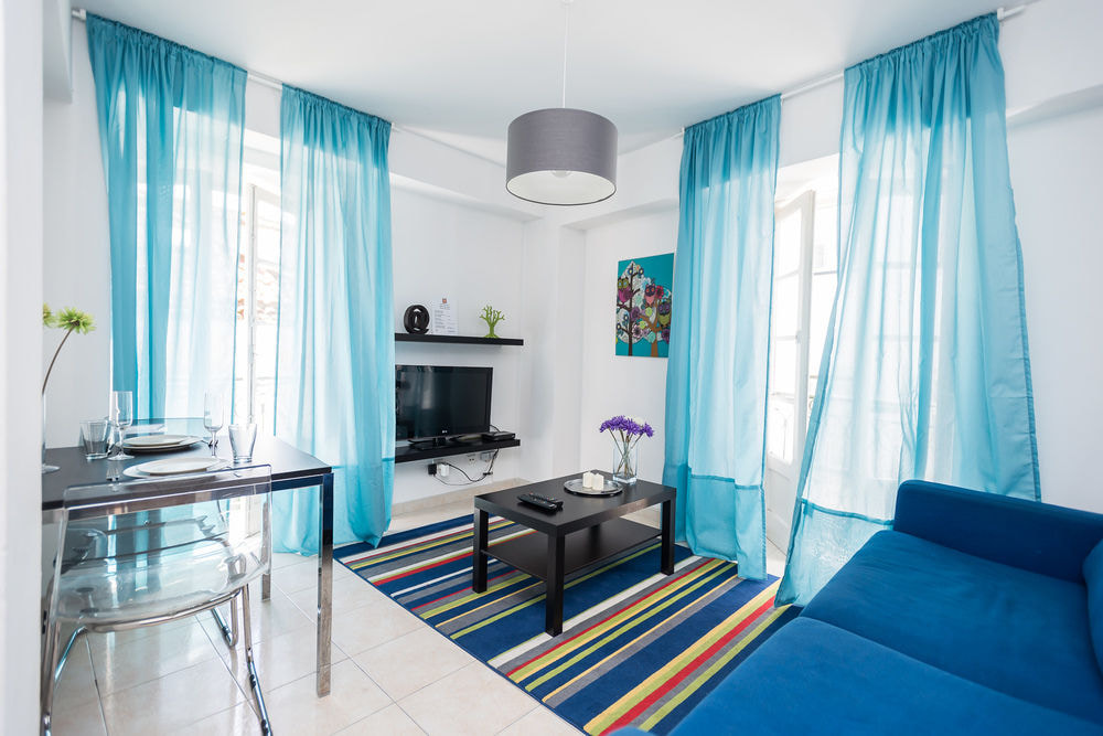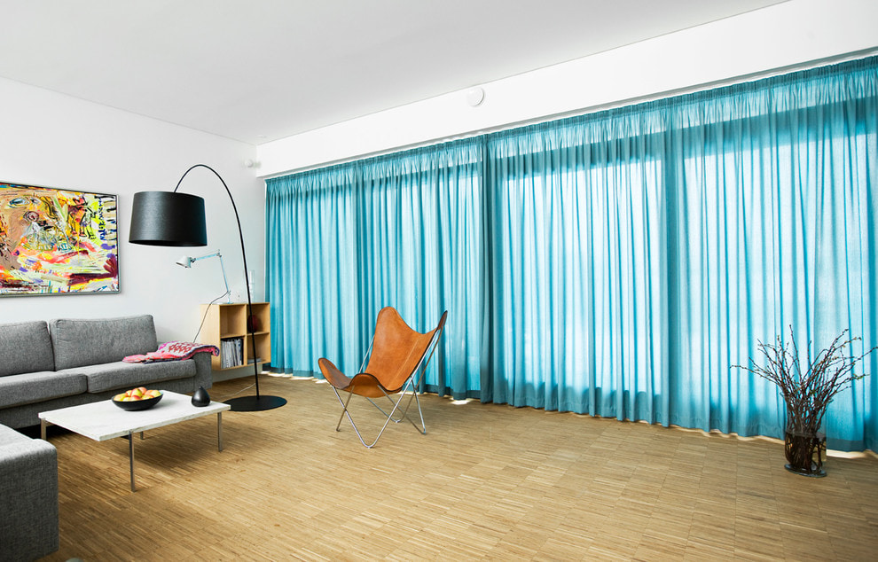 On the picture living room in light colors, the emphasis is on the curtains in bright blue.