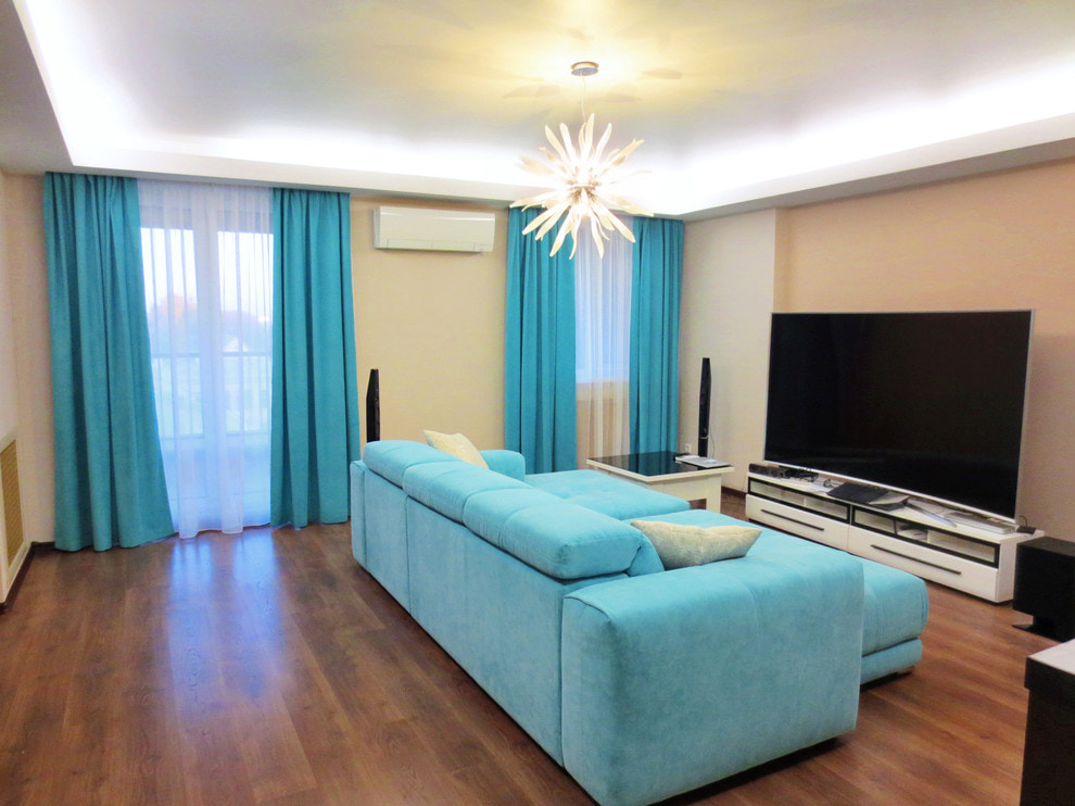 A modern living room or hall will be decorated with straight blackout curtains with a classic fastening or on eyelets, which can be supplemented with tulle. Blue-white or blue-gray curtains look harmoniously with light and dark finishes. The look of a classic living room will be completed with long blue curtains with tiebacks or holders in combination with plain tulle or draped curtains.