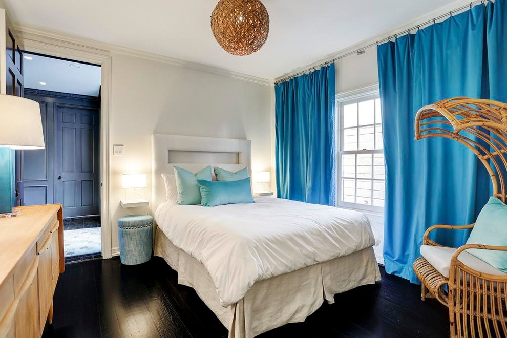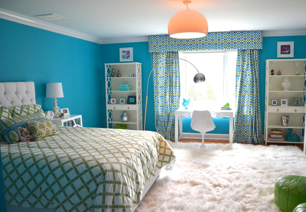 On the picture bright bedroom. One of the walls is finished in bright blue and decorated with curtains with threads of the same shade.