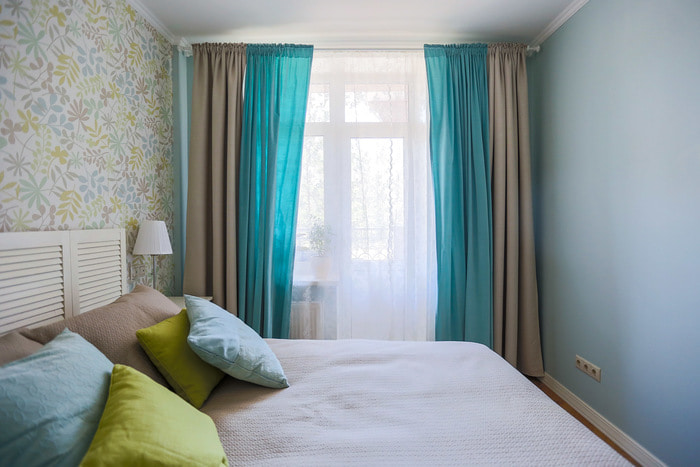 The combination can consist of tulle curtains and heavy blue curtains or two types of curtain fabrics. Solid tulle curtains look harmoniously with blackout curtains with patterns or patterns. An interesting idea will be multilayer dense curtains made of monochromatic and multi-colored material.