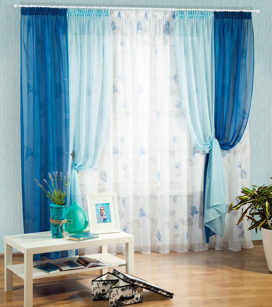 Blue tulle or voile will look harmonious in combination with thick curtains of a darker shade or as the only window decoration, without any additions.