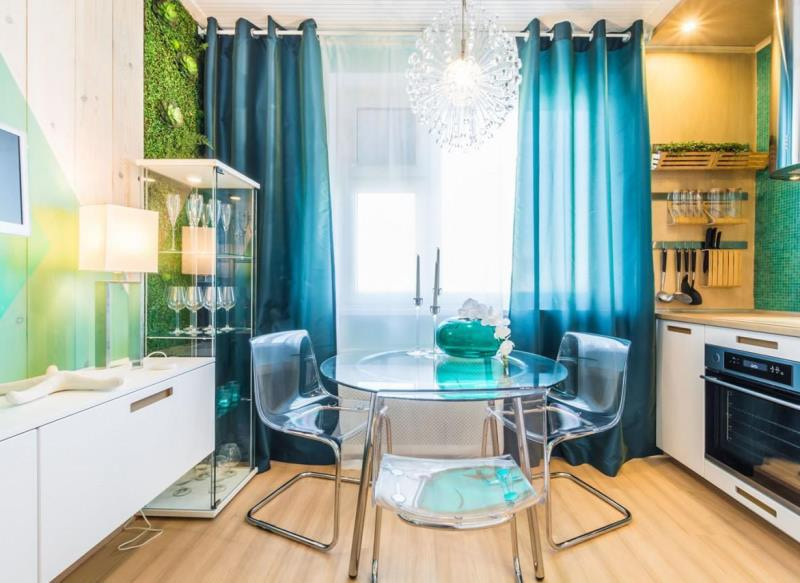 On the picture studio kitchen with azure decor elements.