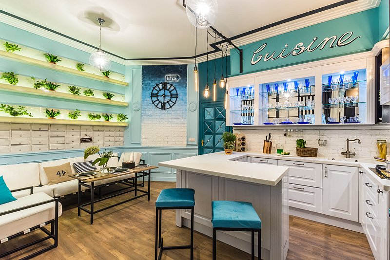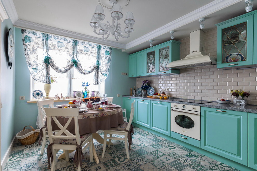 For a Provence-style room, light turquoise is suitable. Natural materials are used in the decoration, such as painted wooden floors. In the kitchen, the set can be made of mint-colored wood.