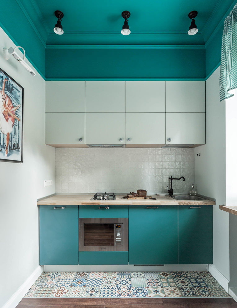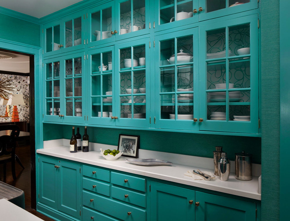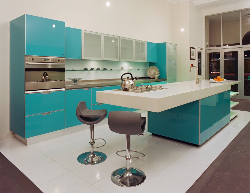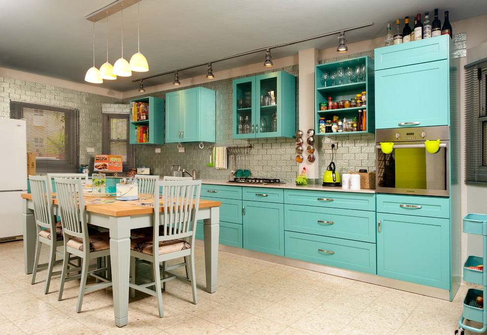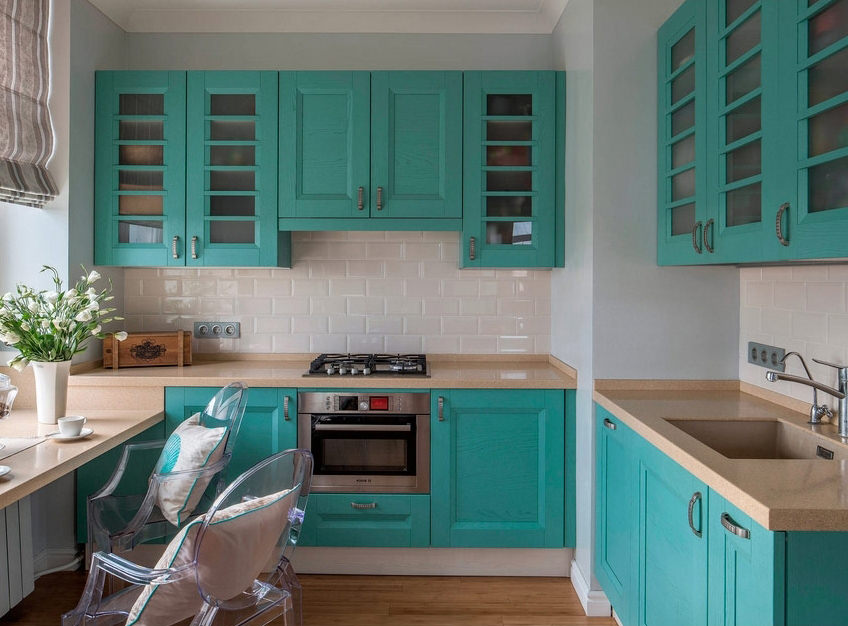 In a kitchen with a turquoise finish, a white set looks harmoniously. Kitchen sets made of natural wood are suitable for country and Provence style, rustic and shabby chic. Glossy turquoise furniture will visually increase the space, while looking juicy. The matte surface of the facades is suitable for classic kitchens. The interior will be complemented by white porcelain dishes and textiles.