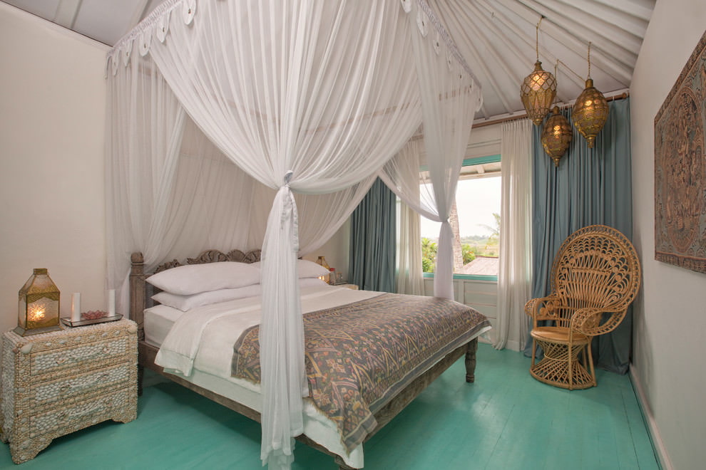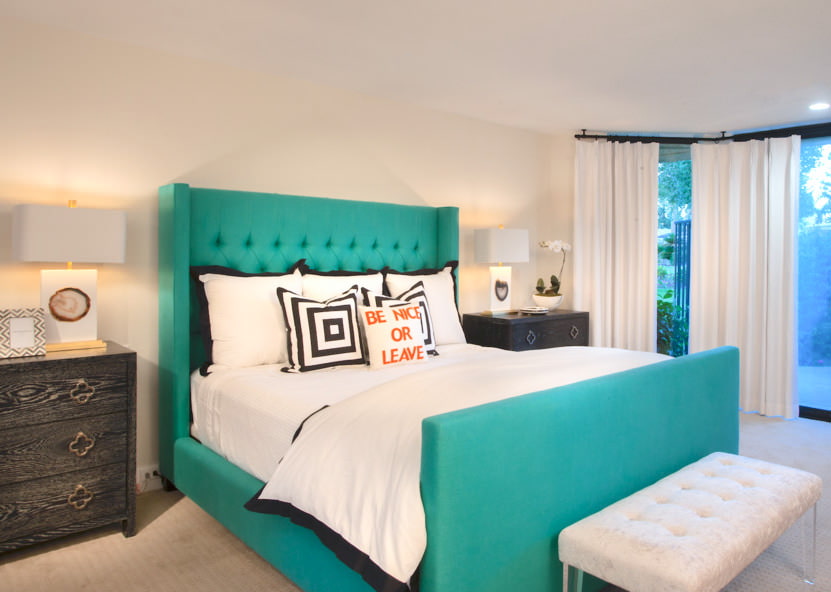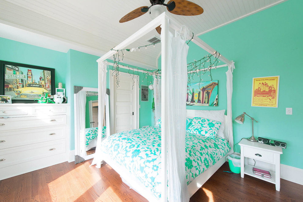 A turquoise bed looks harmonious in a bedroom with a light finish. The interior will be complemented by tulle curtains matching in color.