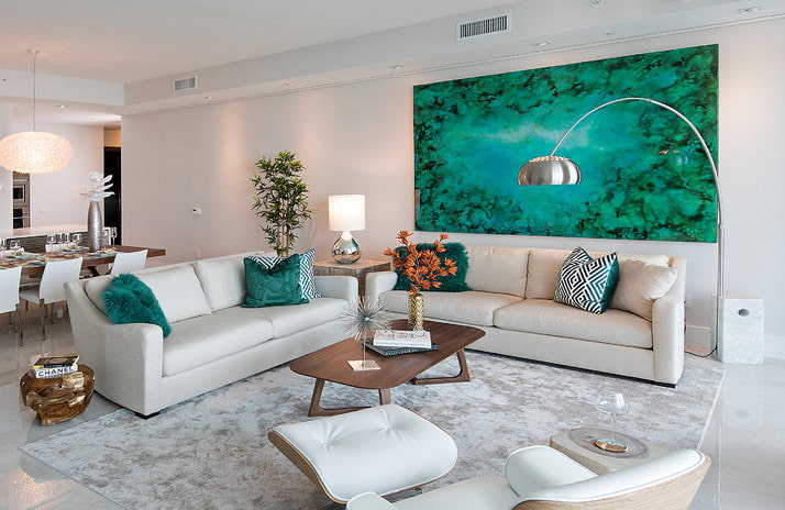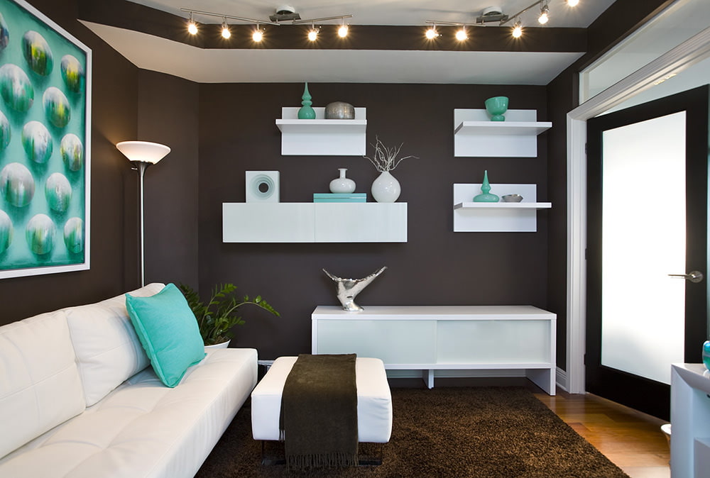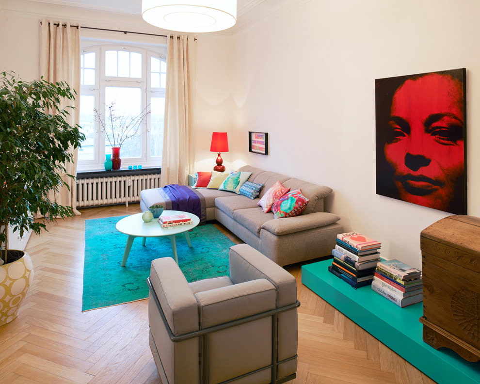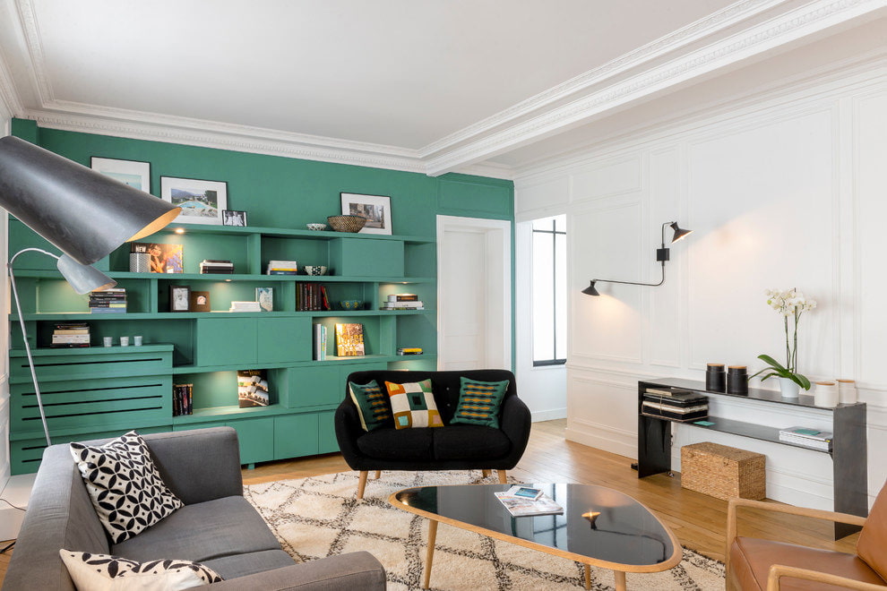 Combined with dark pieces of furniture, the interior will be bright but illuminating. In the living room with a light finish, an aquamarine sofa will accentuate attention and designate a relaxation area.