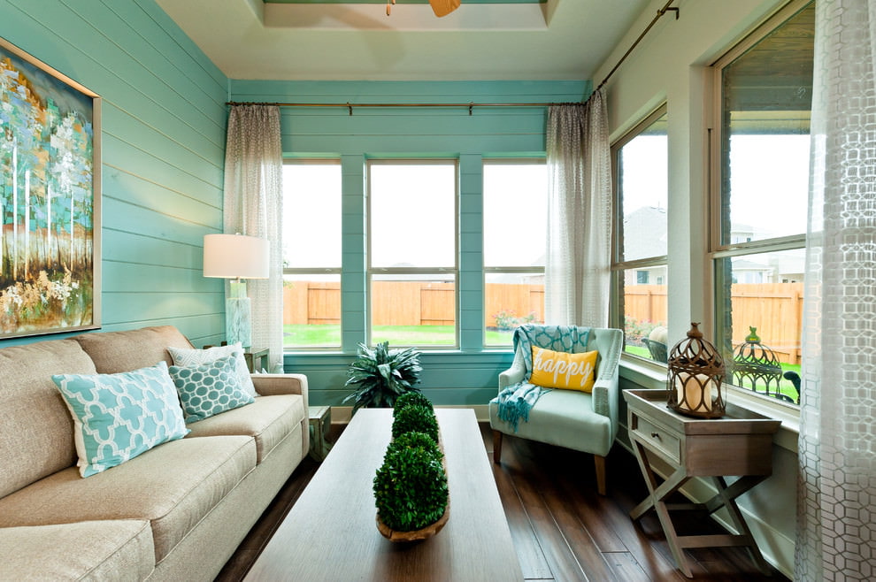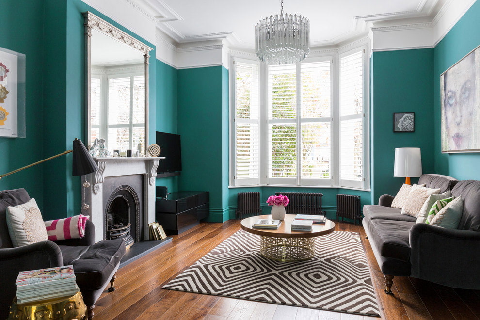 Light turquoise will be a suitable option for a small room. A dark color is suitable for finishing the office and living room. You can also combine shades in the interior of one room.