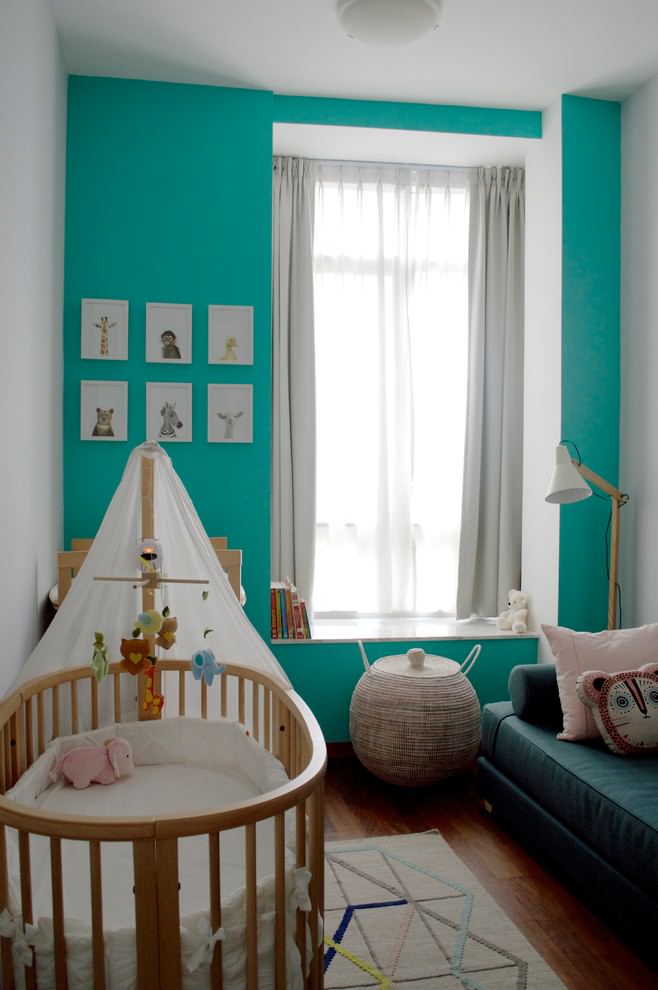 Decorating a nursery in turquoise will be one of the best interior solutions. Combined with a blue or purple hue, you can create a vibrant room. Wall murals not only look spectacular, they will contribute to the development of the child and can emphasize the theme of the room.