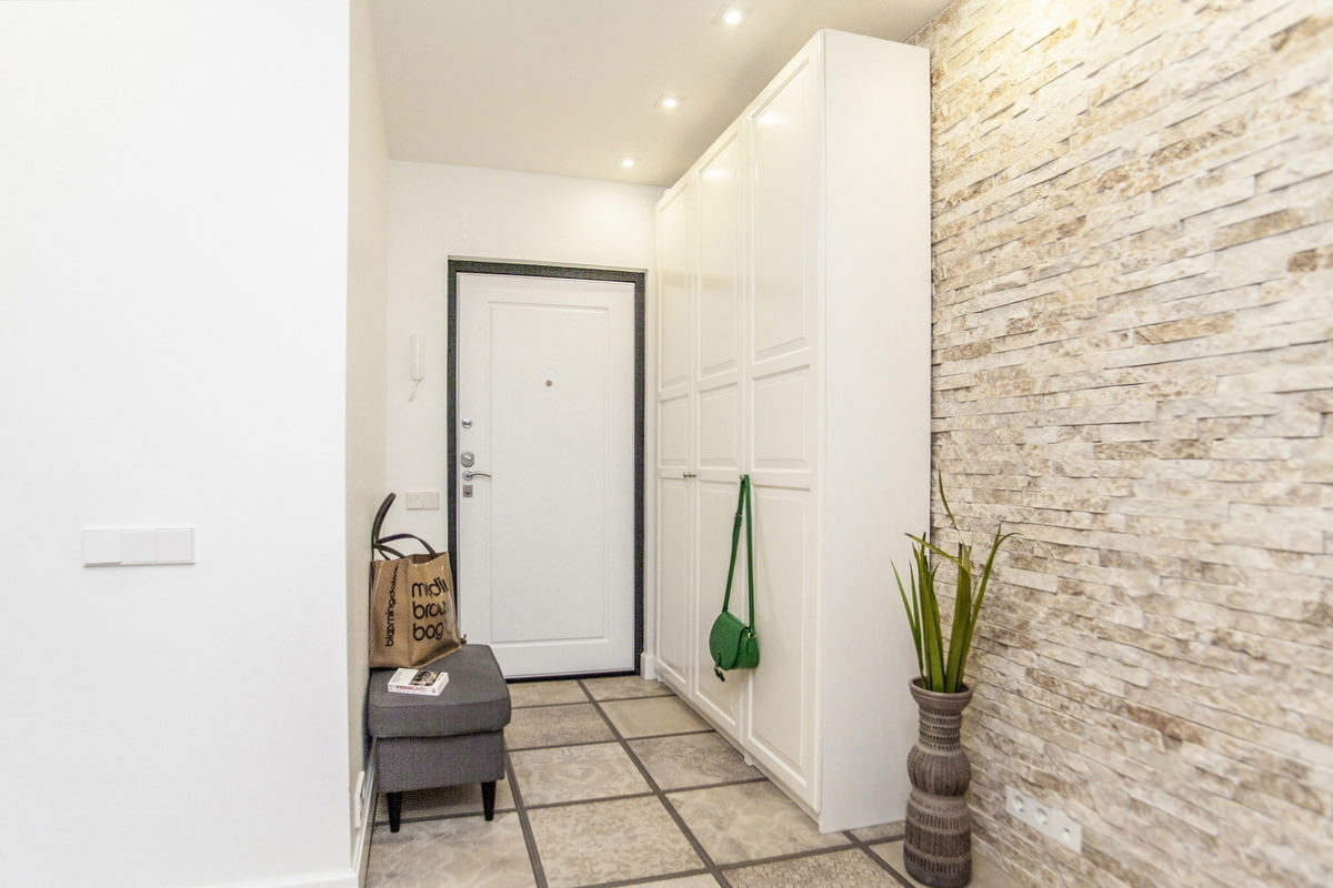 The photo shows the interior of the hallway with a wall lined with decorative bricks of a light shade.