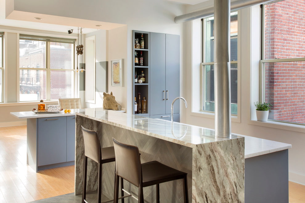 The photo shows the interior of the kitchen with a bar counter made of liquid decorative stone.