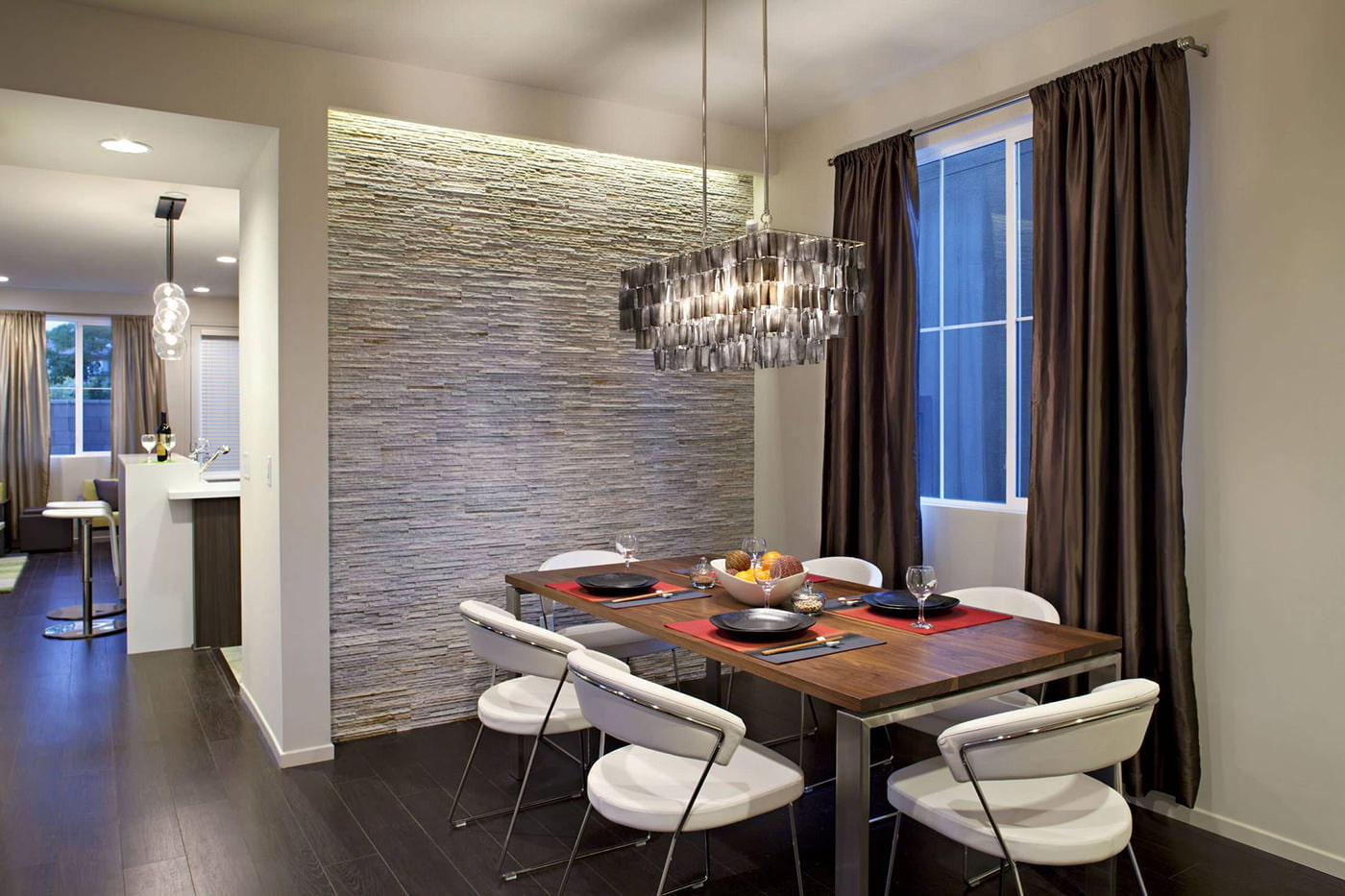 The photo shows a decorative stone cladding in a light shade on the wall in the interior of the dining room.