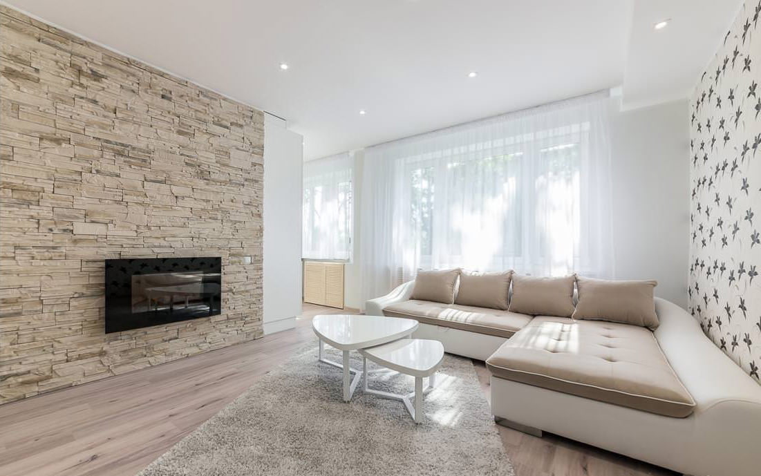 The photo shows a decorative stone of a dark shade on the wall in the interior of a spacious living room.