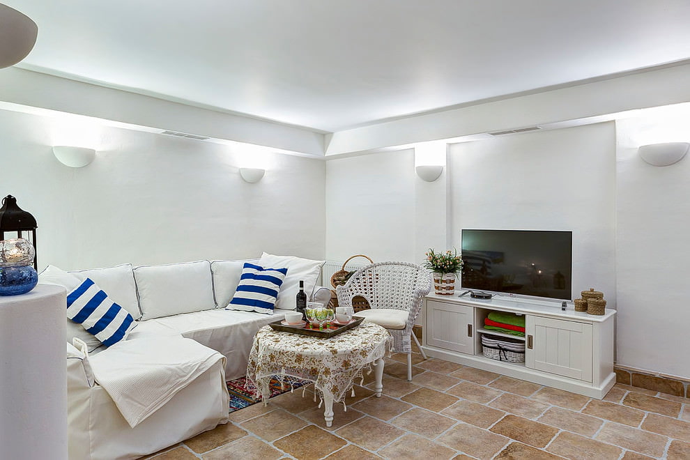 In a Mediterranean style interior, the living room should have a wide window or it should be decorated with curtains to leave the window as open as possible. For the floor, a board with scuffs and roughness is used.