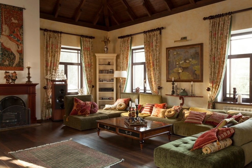 Inclined to ostentatious luxury, it is distinguished by natural furniture with carvings, decoration of the ceiling with frescoes or stucco molding with a voluminous chandelier, arches or columns. For decoration, use is made of tableware in the buffet, clocks, paintings, frames and homemade accessories. There are large windows or access to a balcony, veranda, bay windows, free space and combined areas, interior doors and partitions are rarely used.