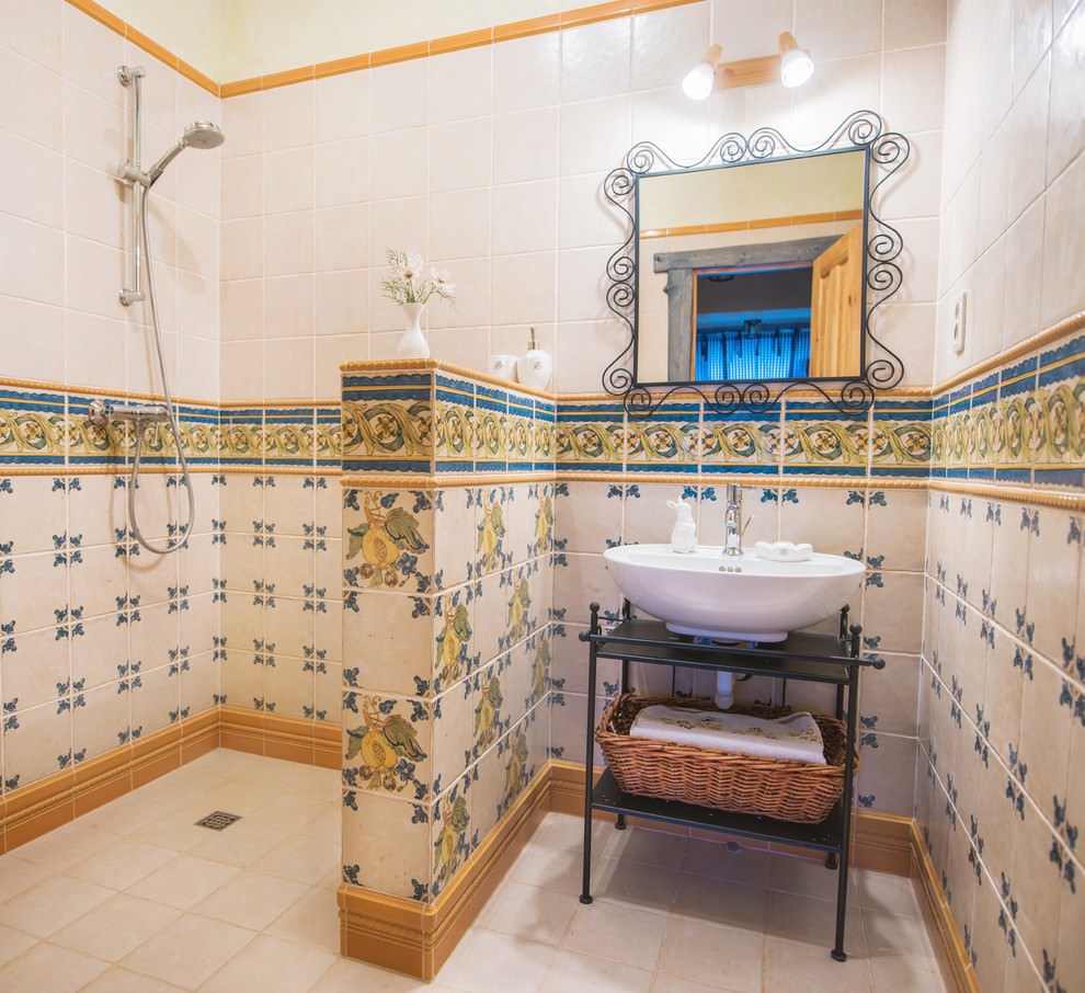 The bathroom must have a large mirror and a wrought iron chandelier.