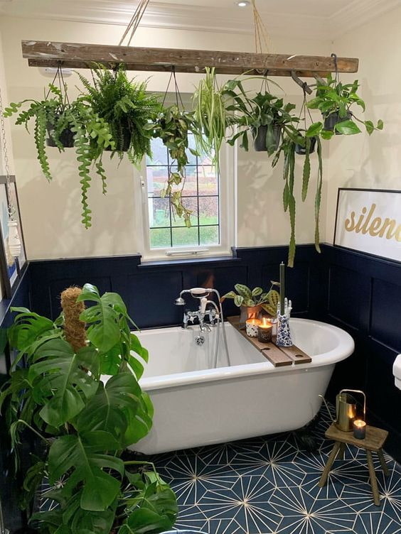Another impressive solution - plants over dining table... They will provide comfort in the dining room and add a natural touch to the room. And if there is windows in the bathroom, indoor flowers on the ceiling will create a unique atmosphere and help you relax in the bath after a hard day.