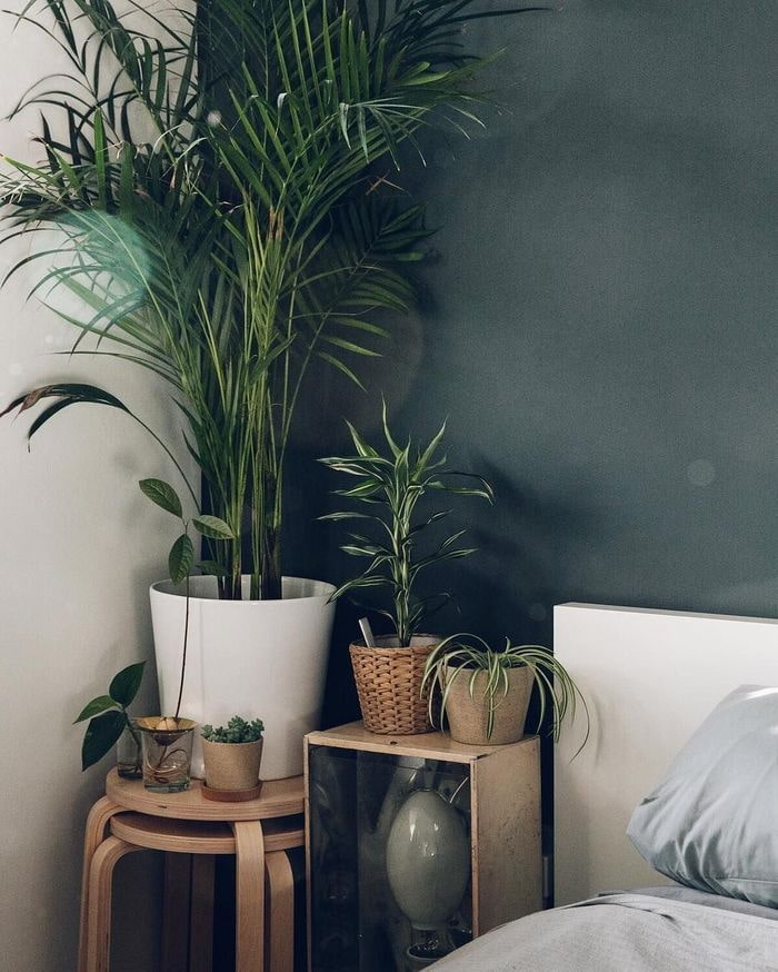 Plantings with falling branches and leaves are best placed on a cupboard, making sure that the opening doors do not touch the shoots. To decorate or disguise unsightly pots, you can use wooden boxes appropriate in style loft, scandi and eco.