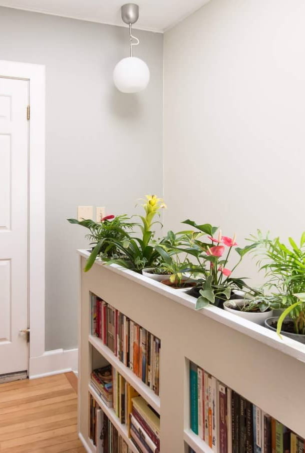 A collection of low plants should be placed between the slopes, attaching transparent or wooden shelves, painted white: this way they will reduce the absorption of natural light entering the room.
