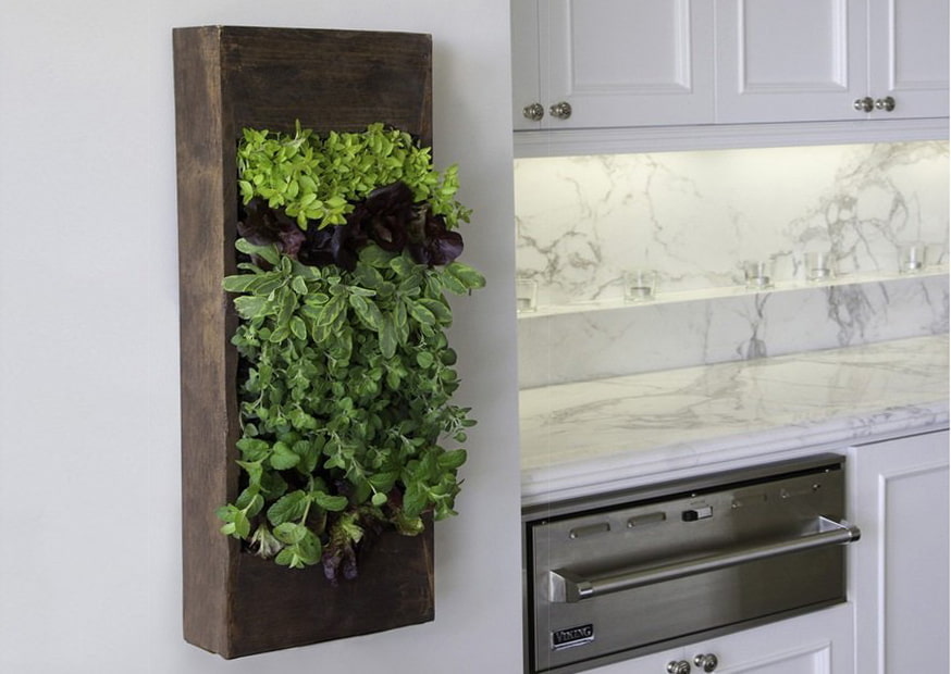 A phytowall or a living panel can be made from unpretentious succulents or stabilized moss that does not require maintenance. In the kitchen, it is useful to break up a small vegetable garden with edible herbs: if there is not enough space, the structure should be placed vertically, using wooden slats as a base.