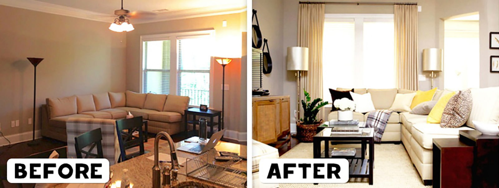 We start small. We inspect the premises and look for things that can be put into boxes or transferred to new owners. So we unload the interior to make it freer and lighter. More space and easier cleaning. After putting things in order, you can move the furniture: by changing the surrounding space, we make it more comfortable and bring variety to life. After the rearrangement, the familiar apartment will seem renewed.