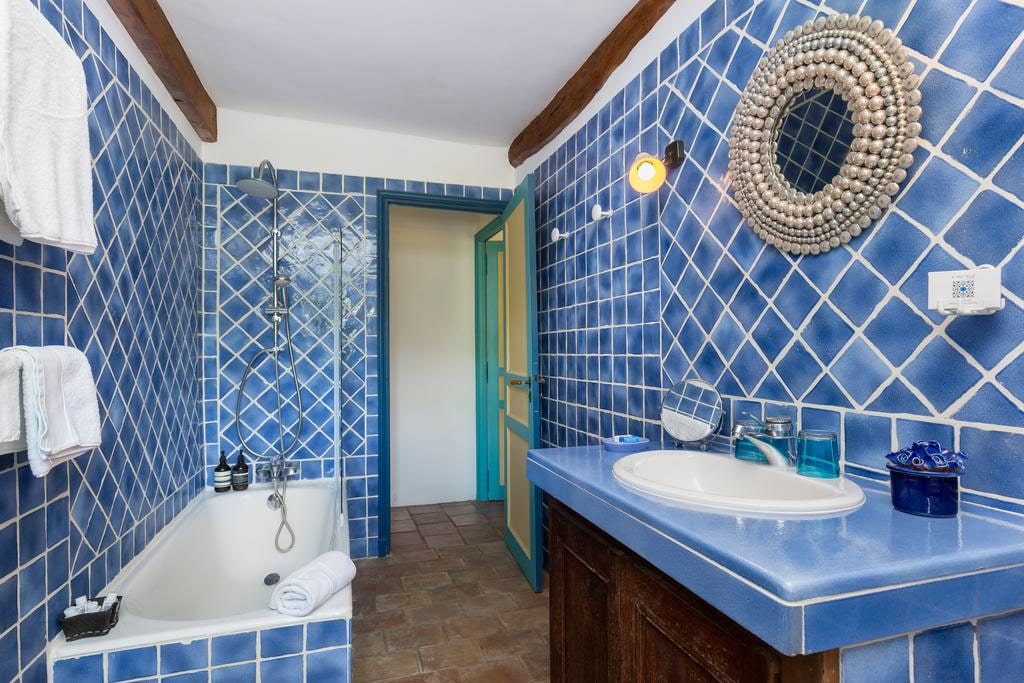 In the photo, the interior of the bathroom with blue tiles in combination with a fugue of a golden hue.