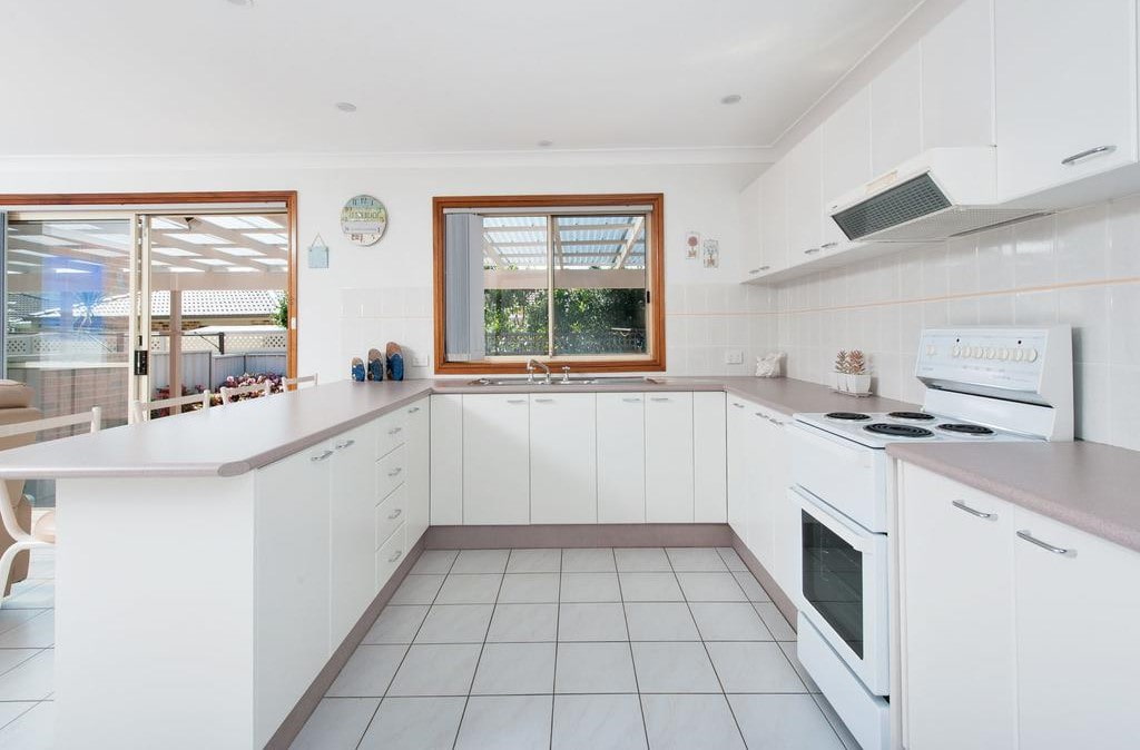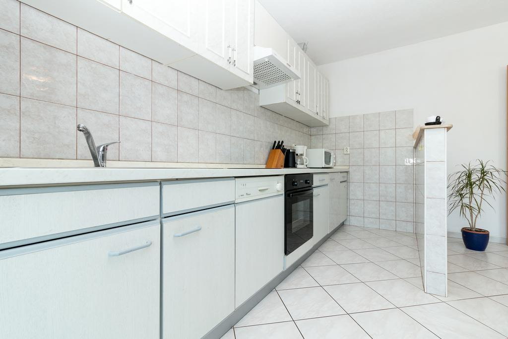 The photo shows a white tiled cladding with black grout on the wall in the interior of the kitchen.