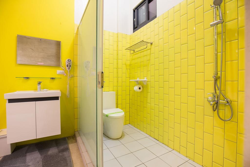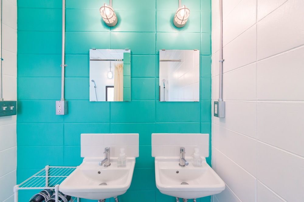 Light blue tile finishes can be accentuated with white, yellow or dark blue color schemes.