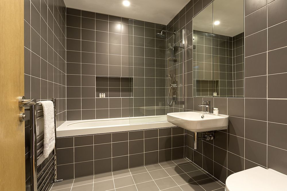 The photo shows a bathroom interior with a contrasting grout for wall and floor tiles.