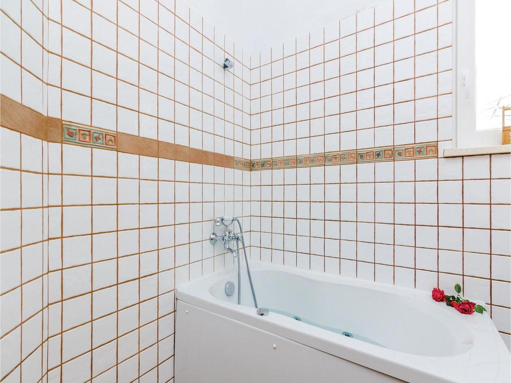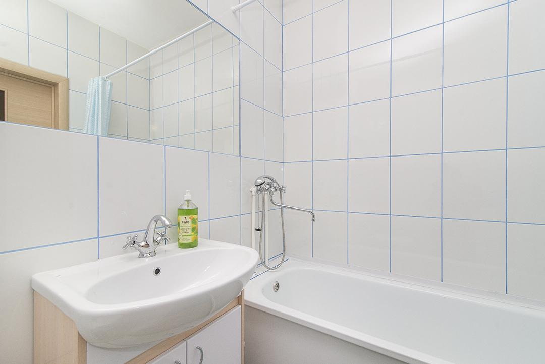 The photo shows a combination of a white grout mixture with a gray tiled finish in the interior of the bathroom.